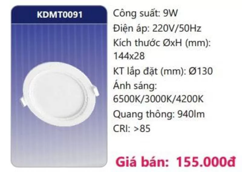 Công suất: 9W Điện áp: 220V/50Hz Kích thước ØxH (mm): 144 x 28 Kích thước lắp đặt (mm): Ø130 Ánh sáng: 3000K/4200K/6500K Quang thông: 940lm CRI: >85