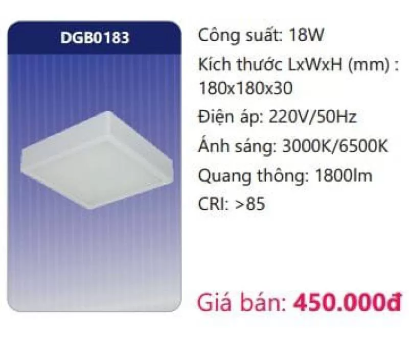 Công suất: 18W Kích thước LxWxH (mm): 180 x 180 x 30 Điện áp: 220V/50Hz Ánh sáng: 3000K/6500K Quang thông: 1800lm CRI: >85