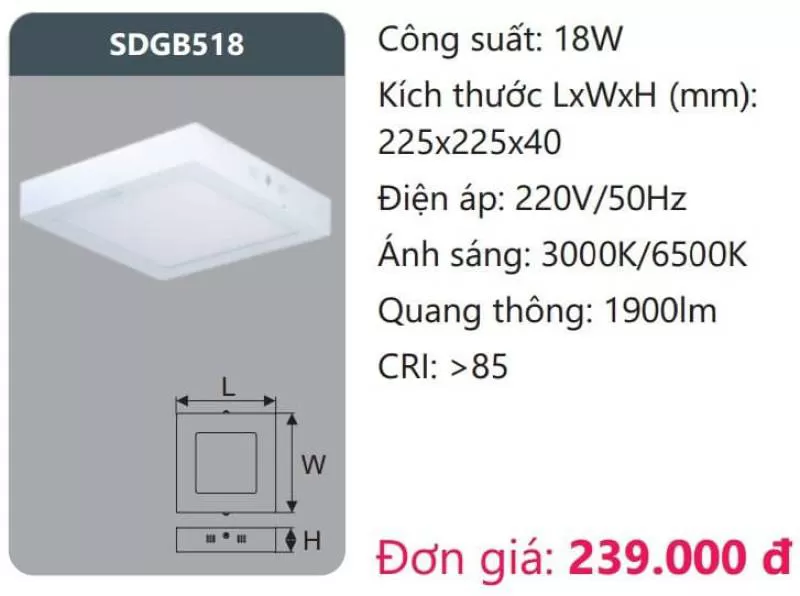Đèn LED panel gắn nổi SDGB518 Công suất: 18W Kích thước LxWxH (mm): 225 x 225 x 40 Điện áp: 220V/50Hz Ánh sáng: 3000K/6500K Quang thông: 1900lm CRI: >85 Xem thêm bảng giá Full: https://skyled.com.vn/bang-gia-den-duhal-moi-nhat/