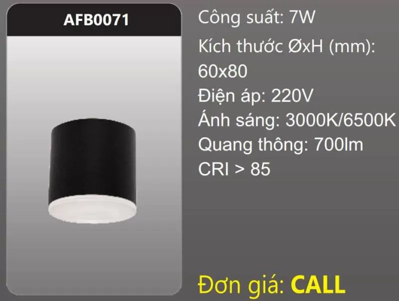 Đèn LED tròn tán quang gắn nổi trang trí AFB0071 Công suất: 7W Kích thước ØxH (mm): 60 x 80 Điện áp: 220V Ánh sáng: 3000K/6500K Quang thông: 700lm CRI > 85 Xem thêm bảng giá Full: https://skyled.com.vn/bang-gia-den-duhal-moi-nhat/Shipping/Vận chuyển