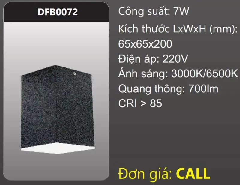 Đèn LED vuông tán quang gắn nổi trang trí DFB0072 Công suất: 7W Kích thước LxWxH (mm): 65 x 65 x 200 Điện áp: 220V Ánh sáng: 3000K/6500K Quang thông: 700lm CRI > 85 Xem thêm bảng giá Full: https://skyled.com.vn/bang-gia-den-duhal-moi-nhat/Shipping/Vận chuyển