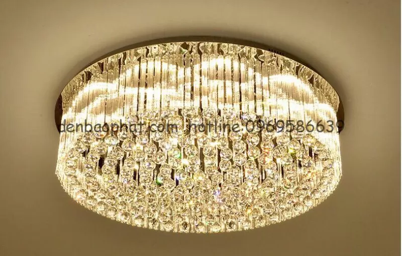 KT: Đường kính 1000 cao 30mm Chất liệu: Khung thép, Pha lê K9 cao cấp Đèn: Led 3 chế độ mầu trắng vàng trung tính