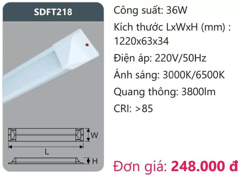 Đèn ốp trần LED SDFT218 Công suất: 36W Kích thước LxWxH (mm): 1220 x 63 x 34 Điện áp: 220V/50Hz Ánh sáng: 3000K/6500K Quang thông: 3800lm CRI: >85 Xem thêm bảng giá Full: https://skyled.com.vn/bang-gia-den-duhal-moi-nhat/