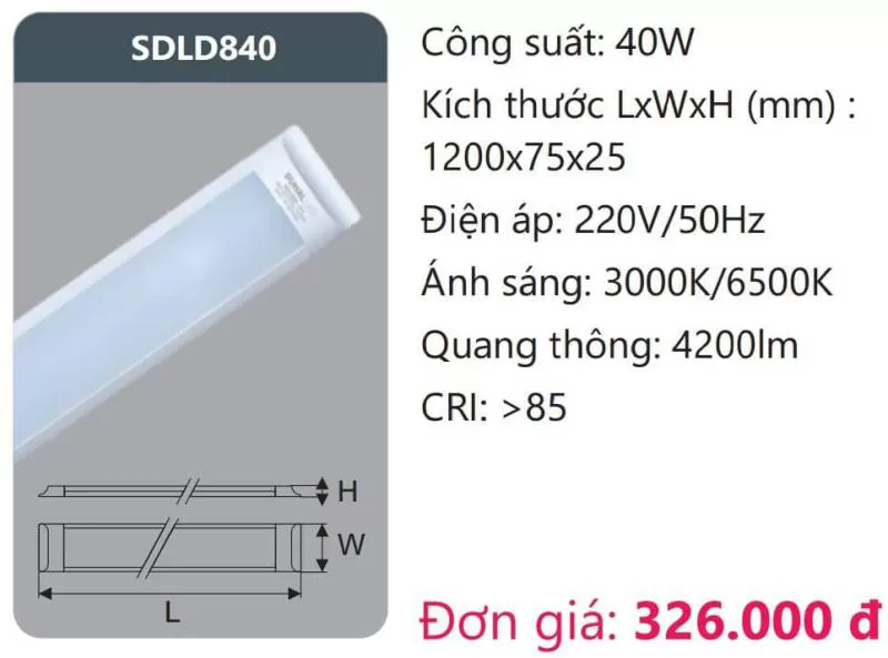 Đèn ốp trần LED SDLD840 Công suất: 40W Kích thước LxWxH (mm): 1200 x 75 x 25 Điện áp: 220V/50Hz Ánh sáng: 3000K/6500K Quang thông: 4200lm CRI: >85 Xem thêm bảng giá Full: https://skyled.com.vn/bang-gia-den-duhal-moi-nhat/