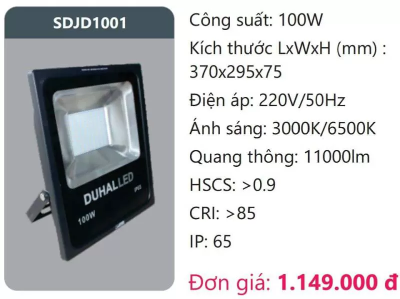Đèn pha LED SDJD1001 Công suất: 100W Kích thước LxWxH (mm): 370 x 295 x 75 Điện áp: 220V/50Hz Ánh sáng: 3000K/6500K Quang thông: 11000lm HSCS: >0.9 CRI: >85 IP: 65 Xem thêm bảng giá Full: https://skyled.com.vn/bang-gia-den-duhal-moi-nhat/