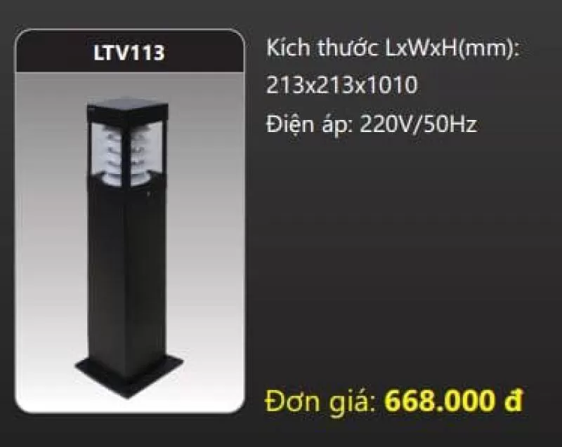 Đèn sân vườn LTV113 Kích thước LxWxH (mm): 213 x 213 x 1010 Điện áp: 220V/50Hz