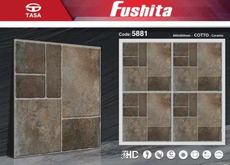 Gạch lát nền TASA FUSHITA sân vườn màu vàng sét 5881 bền đẹp giá rẻ tốt nhất. Kích thước: 600×600 mm Bề mặt nhám chống trơn Chất liệu Ceramic mẫu mới. Vận chuyển Miễn phí