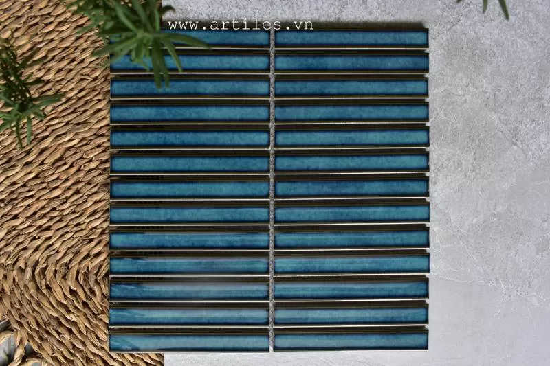 GẠCH MOSAIC QUE ĐŨA MHT 077Màu Sắc : Màu Xanh BiểnLoại men : gốm sứ phủ menKích thước viên : 20 mm x 145 mmKích thước vỉ: 298 mm x 301 mmĐộ dày : 8 mmQuy cách : 11 vĩ = 1m2Đóng gói : 1 thùng 14 vĩ = 1.256 m2Cân Nặng : 15 KgGiá : 788.000 đ/m2