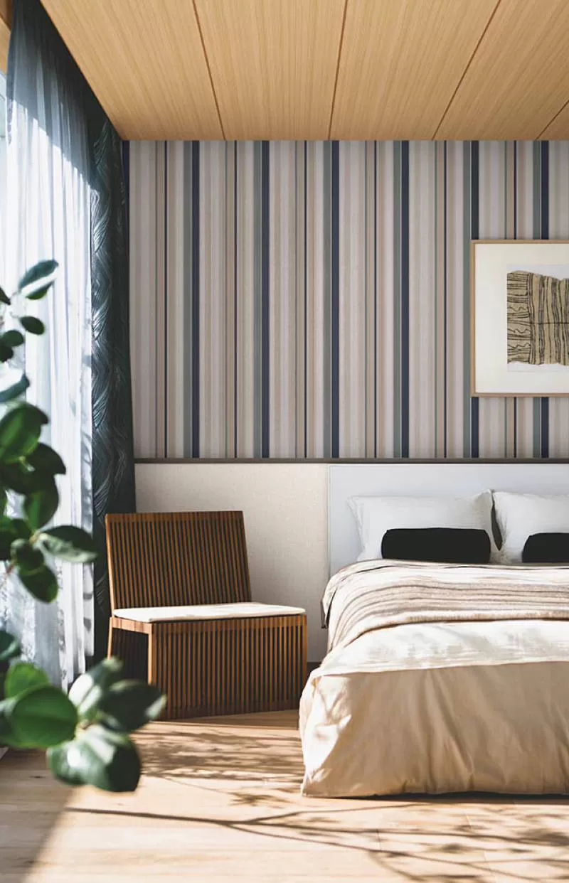 Giấy dán tường màu xanh dương là sự kết hợp hoàn hảo của màu biển và trời, mang vẻ thâm trầm, huyền bí thích hợp cho phòng ngủ - nơi cần sự riêng tư.
