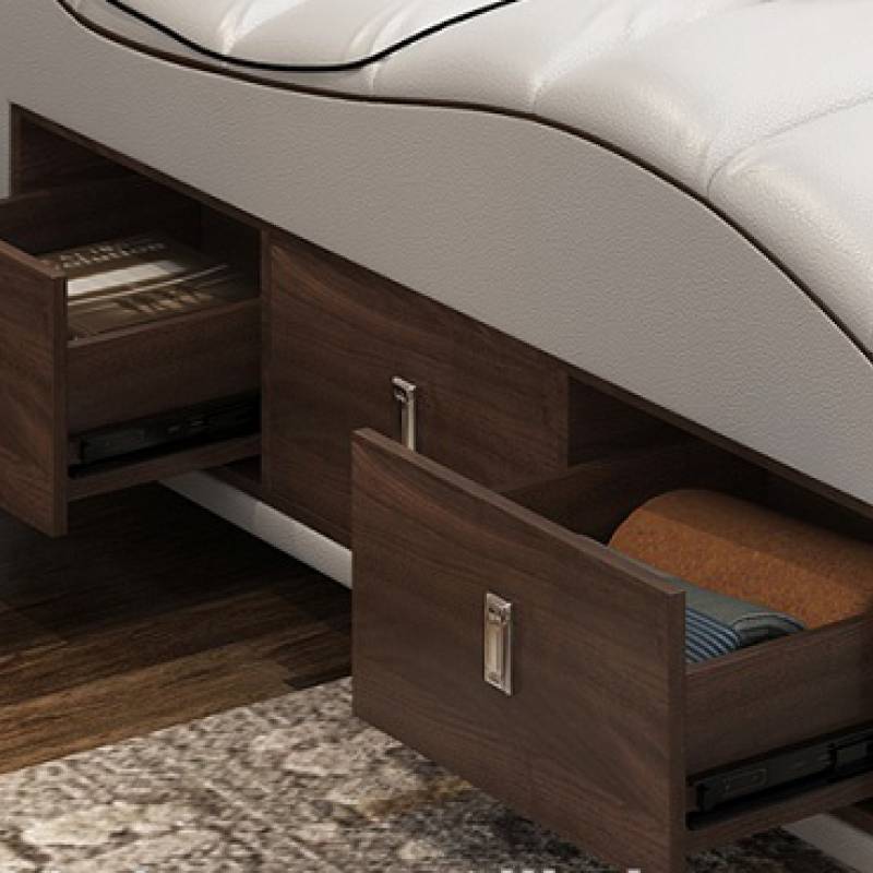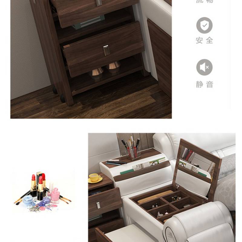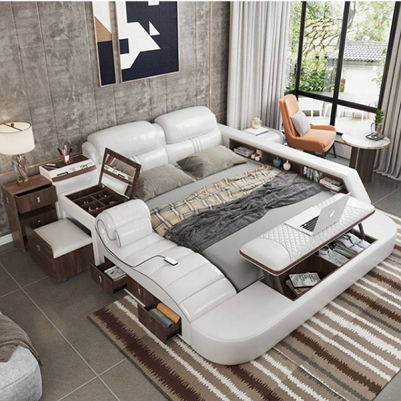 Chỉ cần nhìn qua thôi là bạn đã thấy được những gì mà chiếc giường này đem lại cho con người, ngoài ghế để massage ra thì các bên giường đều có những ngăn kéo hộc tủ đựng đồ dùng gọn gàng đem lại tính thẩm mỹ cao. 2 bên giường thiết kế bàn trang điểm và bàn làm việc tạo cho bạn một không gian đầy đủ tiện nghi nhưng vẫn ngăn nắp, tiết kiệm diện tích nhất.
