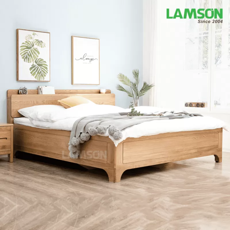 Chất liệu: Gỗ Ash, veneer ash ( gỗ Tần bì ) nhập khẩu Bảo hành: 2 năm Kích thước: 166cm (Rộng) x 213cm (Dài) x 45cm (Cao từ đất lên vai giường) x 90cm (Cao từ đất đến đầu giường) Kích thước nệm: 160 x 200 cm (mua kèm tại Lam Sơn) Màu sắc: Màu gỗ tự nhiên/ màu óc chó (walnut)/ màu cánh dán/ … Sản xuất theo yêu cầu: Ngoài kích thước, màu sắc, kiểu dáng trên nội thất Lam Sơn còn đo thực tế sản xuất theo yêu cầu để phù hợp với thiết kế, không gian mỗi gia đình khách hàng