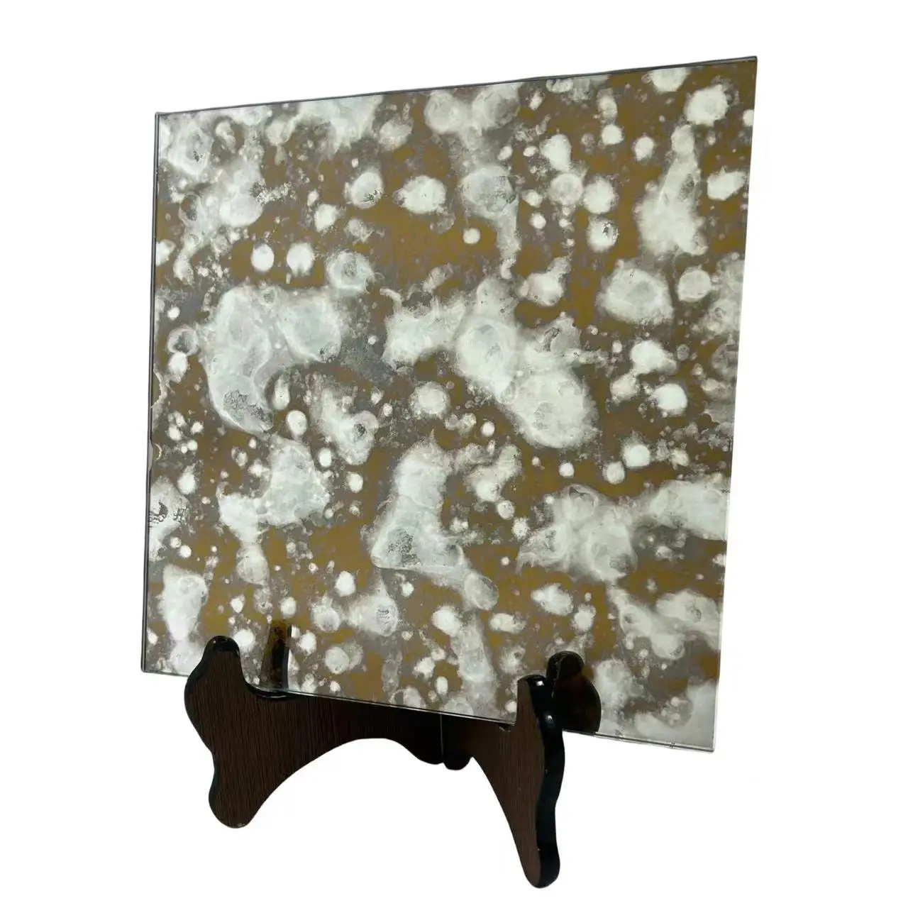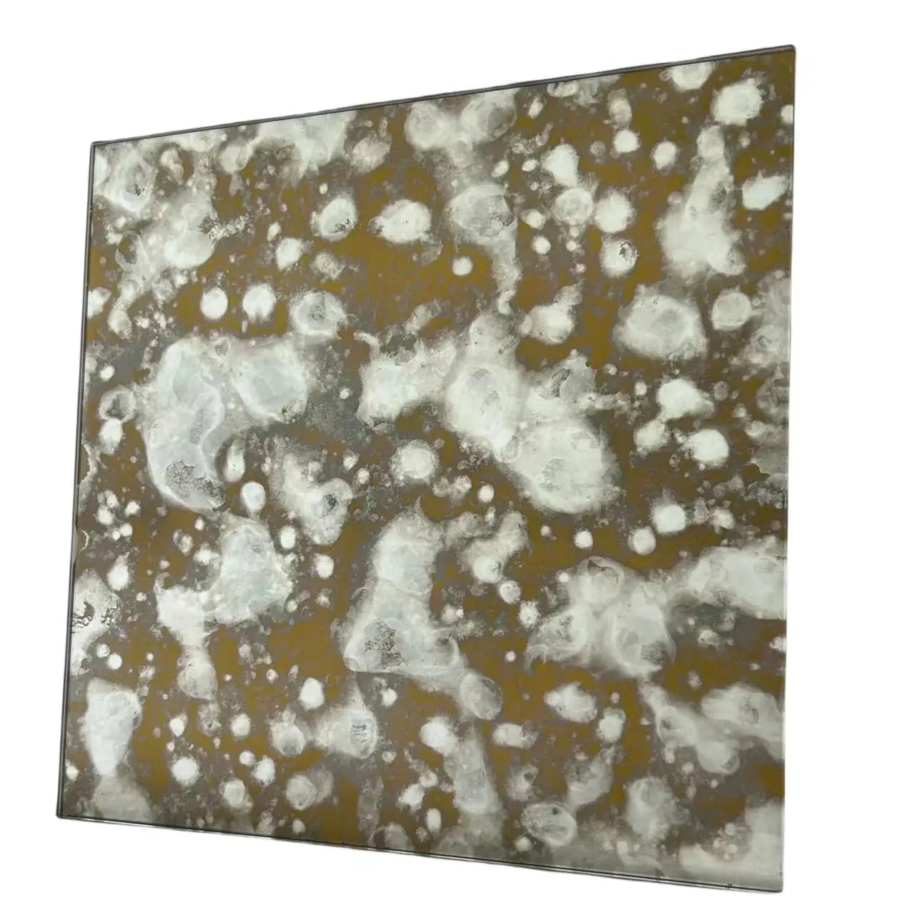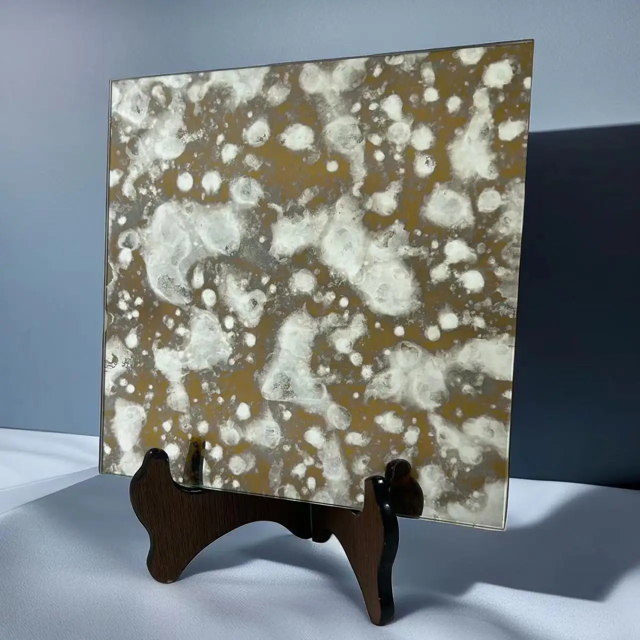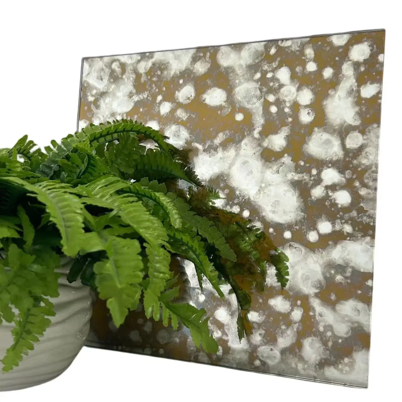 It is one of the deep processing glasses.A variety of patterns, such as oil paintings,are formed on the mirror surface after a special oxidation process.