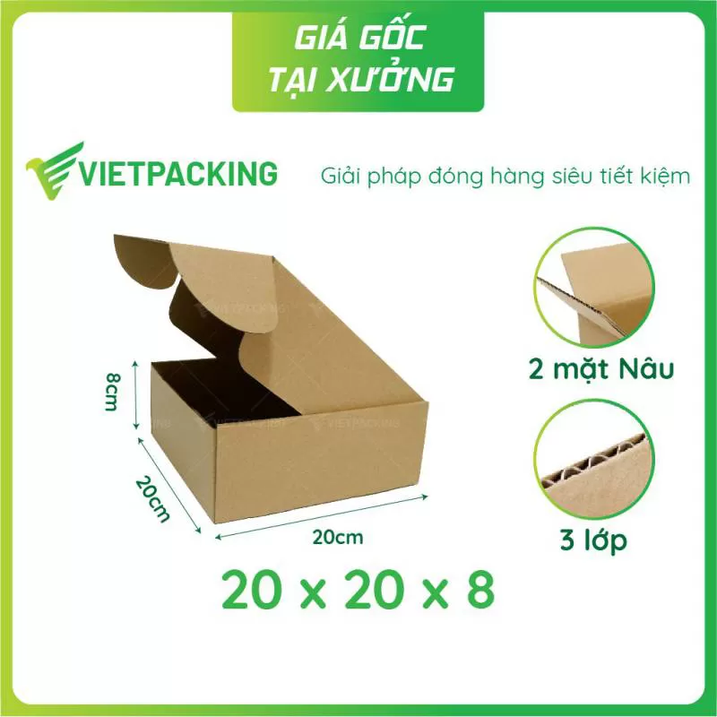 Hộp carton 20x10x5 giao hàng COD, giá tốt, sản xuất tại xưởng. Sản phẩm của Vietpacking với chất lượng gia công cao, đáp ứng mọi tiêu chuẩn của khách hàng.Shipping/Vận chuyển