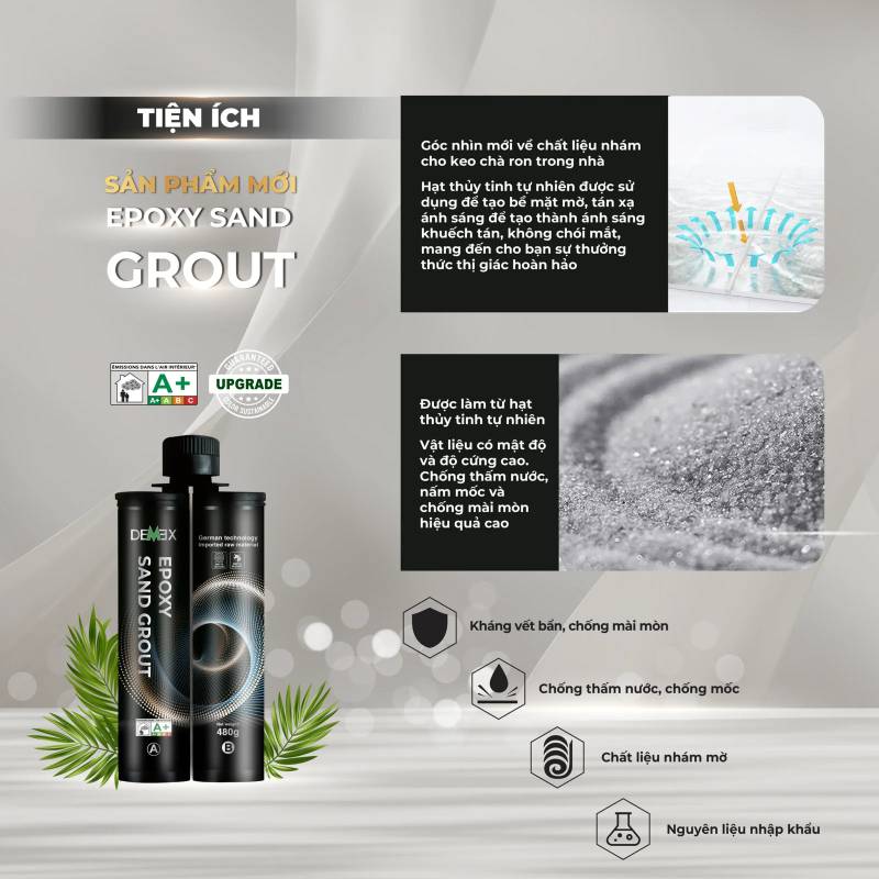 Demex Epoxy Sand Grout là dòng Keo chà ron nhám cho các khu vực trong nhà. Sản phẩm được cấu thành từ các hạt thủy tinh tự nhiên giúp tạo bề mặt mờ, làm tán xạ ánh sáng, không chói mắt mang đến cho bạn sự thường thức thị giác hoàn hảo