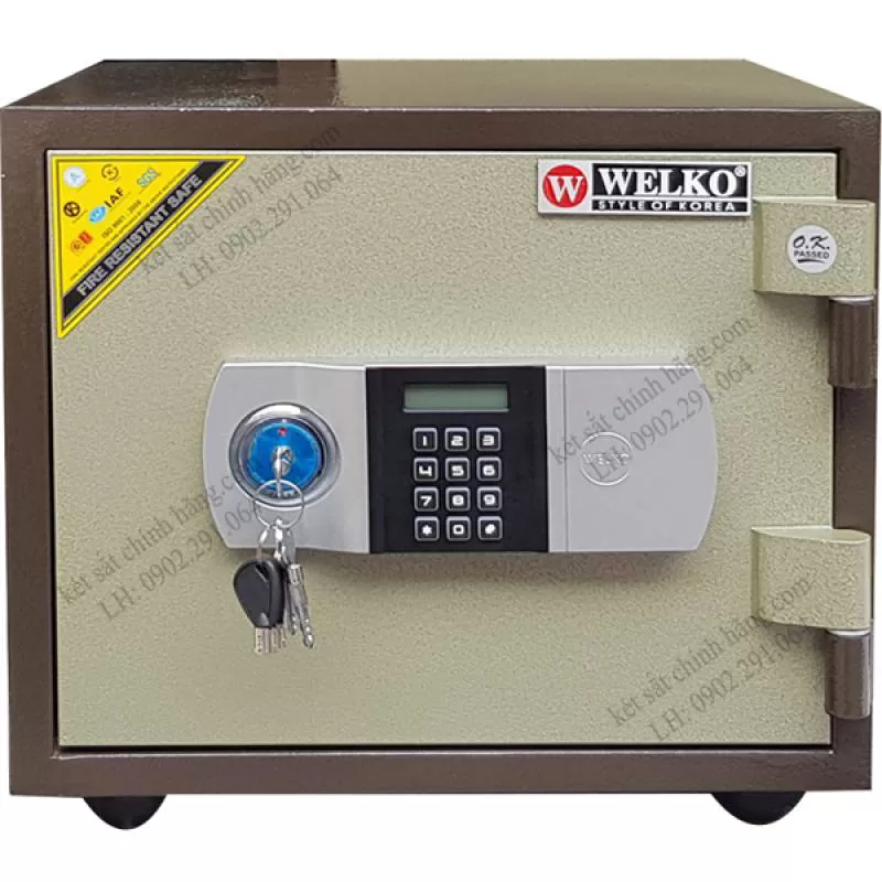Két sắt mini điện tử Welko KCC38DT là két sắt Hàn Quốc cỡ nhỏ để được giấy tờ A4 và có khả năng chống cháy 1200 độ C