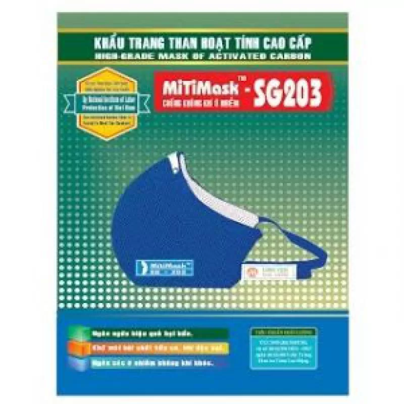 Khẩu Trang Than Hoạt Tính Nhãn Hiệu MitiMask SG203 Đạt Tiêu Chuẩn Chất Lượng Về Bảo Hộ Lao Động, Có Khả Năng Lọc Bụi, Hoá Chất Độc Hại, Khử Mùi, Bảo Vệ Hệ Hô Hấp Và Sức Khỏe. Công Ty Bảo Hộ Xanh Chuyên Cung Cấp Sản Phẩm Chất Lượng.