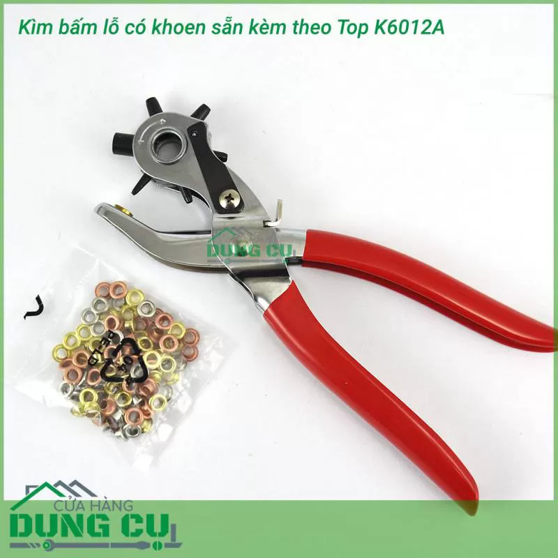 Kìm bấm khoen TOP K6012A kèm khoen Có 5 đầu đục lỗ với kích cỡ lỗ là 1 5mm 2 5mm 3 3mm 4 1mm 4 5mm nên có thể dùng để bấm lỗ dây da đồng hồ bấm lỗ thắt lưng bấm lỗ dây nịt Có 1 đầu dập khoen có thể dùng để đóng khoen cho sổ sách quai túi xách