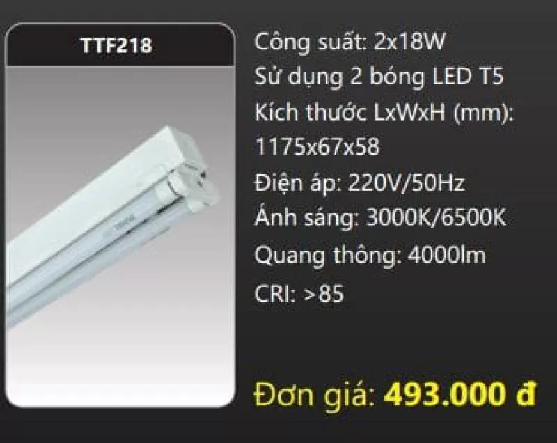 Máng đèn LED Batten T5 TTF218 Công suất: 2x18W Sử dụng 2 bóng LED T5 Kích thước LxWxH (mm): 1175 x 67 x 58 Điện áp: 220V/50Hz Ánh sáng: 3000K/6500K Quang thông: 4000lm CRI: >85