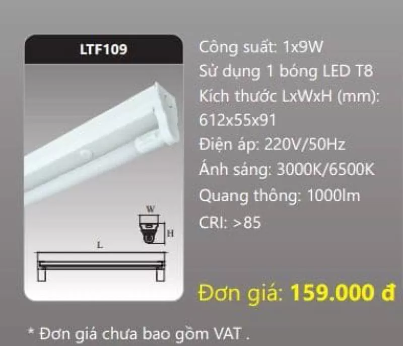 Máng đèn LED Batten T8 LTF109 Công suất: 1x9W Sử dụng 1 bóng LED T8 Kích thước LxWxH (mm): 612 x 55 x 91 Điện áp: 220V/50Hz Ánh sáng: 3000K/6500K Quang thông: 1000lm CRI: >85