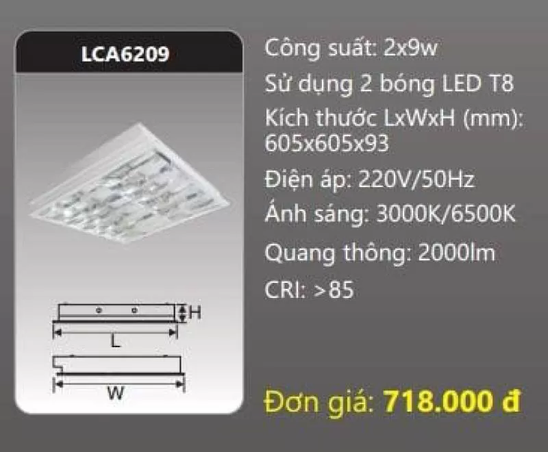 Máng đèn LED phản quang âm trần LCA6209 Công suất: 2x9W Sử dụng 2 bóng LED T8 Kích thước LxWxH (mm): 605 x 605 x 93 Điện áp: 220V/50Hz Ánh sáng: 3000K/6500K Quang thông: 2000lm CRI: >85