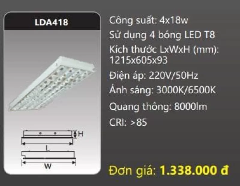 Máng đèn LED phản quang âm trần LDA418 Công suất: 4x18W Sử dụng 4 bóng LED T8 Kích thước LxWxH (mm): 1215 x 605 x 93 Điện áp: 220V/50Hz Ánh sáng: 3000K/6500K Quang thông: 8000lm CRI: >85