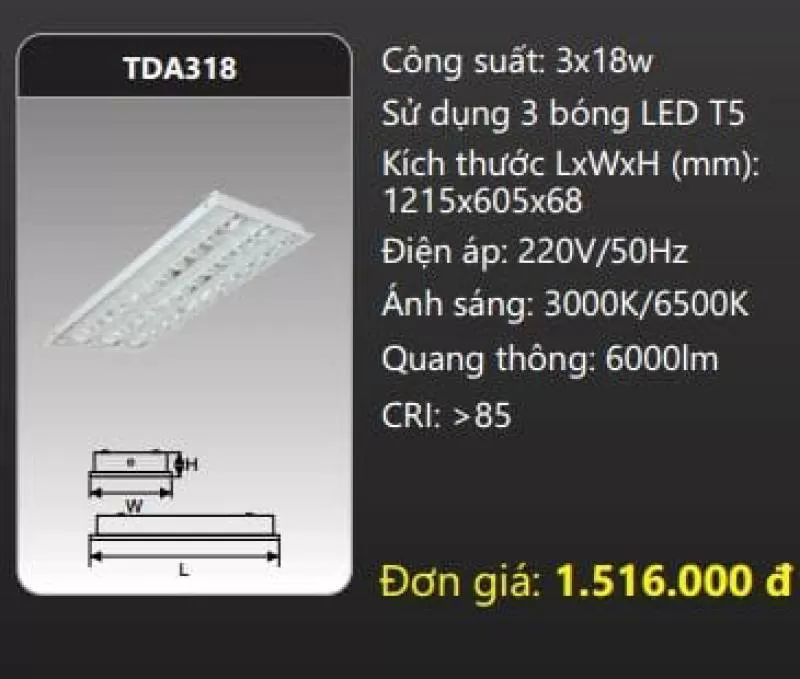 Máng đèn LED phản quang lắp nổi - Âm trần TDA318 Công suất: 3x18W Sử dụng 3 bóng LED T5 Kích thước LxWxH (mm): 1215 x 605 x 68 Điện áp: 220V/50Hz Ánh sáng: 3000K/6500K Quang thông: 6000lm CRI: >85 IP: 44