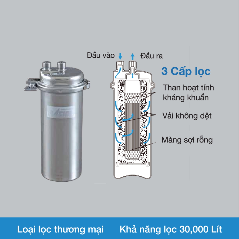 - Công suất lớn 30.000 lít, lưu lượng lọc nước cao 10 lít/phút đáp ứng nhu cầu cho dịch vụ nhà hàng, quan café, bếp ăn công nghiệp,…