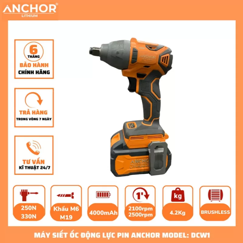 MÁY SIẾT ỐC ĐỘNG LỰC PIN 20V Mã: DCW1 (Lực siết tối đa 330 N.m) - Điện áp :20 V - Khẩu M6-M19 - 2 cấp độ lực siết 250N - 330N - Tốc độ: Level 1: 2100 v/p – Level 2: 2500 v/p - 2 pin 20V / 4Ah - Dung lượng pin: 4.000 mAh - Động cơ: BRUSHLESS không chổi than - Trọng lượng: 1,5 kg Bộ máy gồm: 2 pin 20v (4.0A), sạc đế , 1