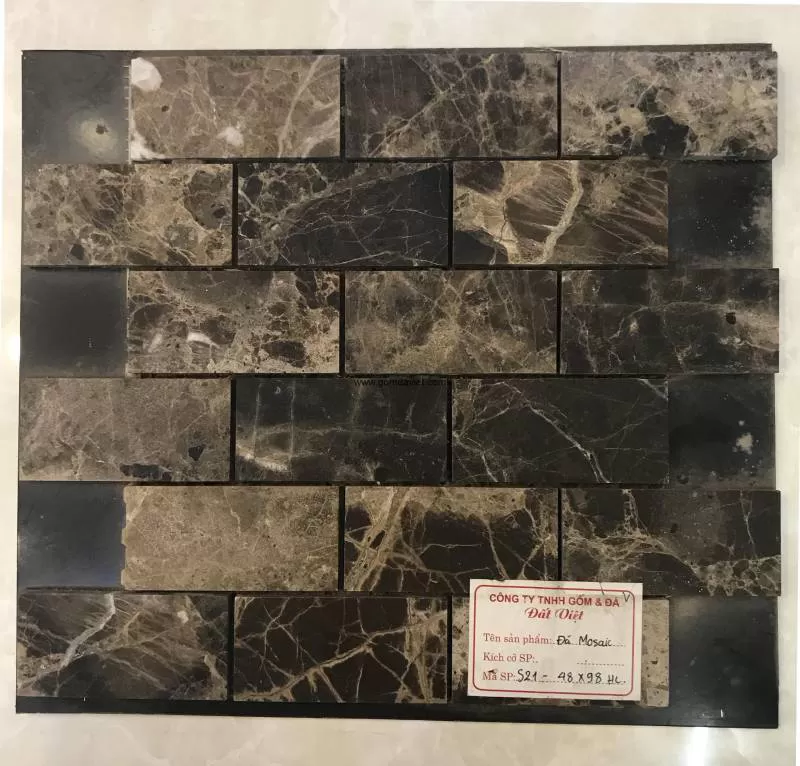 Màu sắc : Màu da báo Mã SP : S21 48x98 Bề mặt : Mài bóng Kích thước vỉ : 300x300x8mm Kích thước viên : 48x98mm Chất liệu : Đá tự nhiên Tây Ban Nha nhập khẩu Cấu tạo của vỉ đá mosaic tự nhiên gồm hai bộ phận chính: - Lớp đá tự nhiên: Đây là bộ phận cấu tạo chính của vỉ đá mosaic tự nhiên. Lớp này bao gồm các viên đá tự nhiên nhỏ, có nguyên liệu chủ yếu từ đá marble tự nhiên, sử dụng công nghệ cắt đá hiện tại. - Lớp lưới dính kết: lớp lưới mỏng bên dưới làm nhiệm vụ kết dính các viên đá mosaic nhỏ với nhau tạo thành các vỉ lớn, để thuận tiện di chuyển cũng như trong quá trình thi công ốp lát đá mosaic tự nhiên. Lớp lưới này bao gồm các sợi lưới thủy tinh kết hợp với giấy kraf bằng keo chuyên dụng. Các sản phẩm đá tự nhiên thường linh hoạt về màu sắc và độ sáng tối, vì vậy trong quá trình thi công có thể trộn lẫn các vỉ đá ở các hộp lại với nhau tùy theo sở thích và con mắt nghệ thuật của chủ nhà hoặc thợ thi công. Ứng dụng: Đá Mosaic tự nhiên được sử dụng phổ biến và rộng rãi ở hầu hết các hạng mục kiến trúc nội và ngoại thất hiện đại như trang trí trong phòng khách, ốp lát hồ bơi, nhà tắm, toilet… Dù được sử dụng ở hạng mục nào, với những độc đáo ở kiểu dáng, chất liệu, độ bền cao, yêu cầu cao sự sáng tạo, tỉ mỉ và cẩn thận trong quá trình thi công, đá Mosaic cũng luôn đem lại vẻ đẹp sang trọng, có chiều sâu và mang tính thẩm mỹ cao.Shipping/Vận chuyển