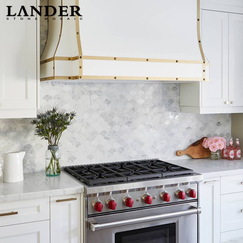 Mosaic đá tự nhiên trang trí hình vảy cá màu trắng LAY889 Carrara được yêu thích sử dụng trong trang trí nhà ở, phòng bếp, nhà tắm, không gian khách sạn, nhà hàng, ..........đem đến không gian vô cùng sang trọng và độc đáo.