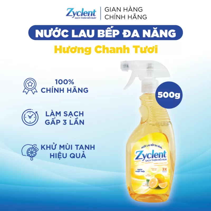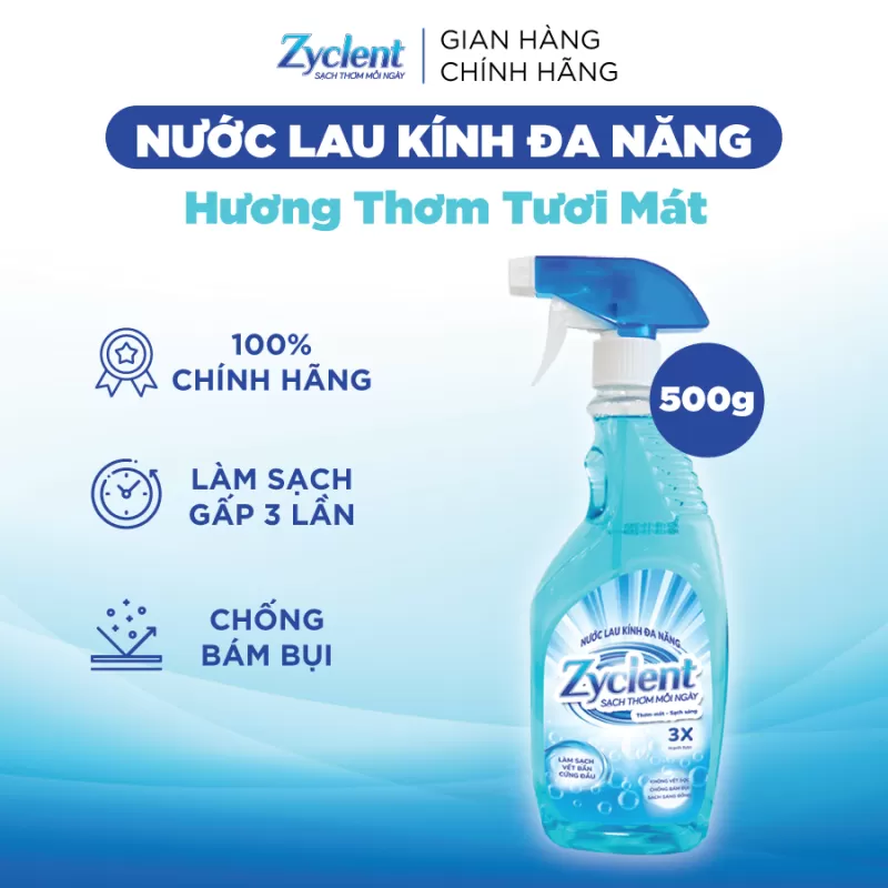 Nước lau kính đa năng Zyclent giúp làm sáng bóng, hạn chế bụi bám trở lại nhờ công thức không độc hại kết hợp với hương thơm dịu nhẹ loại bỏ vi khuẩn và các vết bẩn cứng đầu trả lại cho bạn bề mặt sáng bóng trong trẻo như ban đầu.