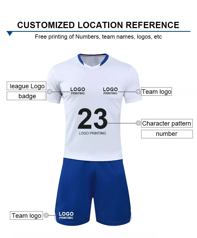Customized Jersey and Short: | Personalize jerseys and shorts with name number, soccer team badge, sponsor logo and team name on chest. All these service free, no extra cost. |