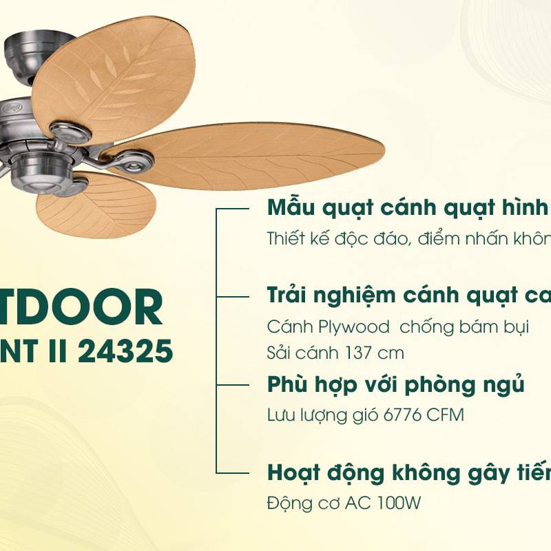 Khác hoàn toàn với thiết kế cánh quạt các sản phẩm khác của thương hiệu Hunter, cánh quạt của Hunter Outdoor 24325 mang một dáng dấp mới mẻ lại vô cùng gần gũi với người Việt. Cánh quạt có thiết kế vân lá giống như những chiếc lá nhiệt đới mang màu ánh vàng của nắng không chỉ mang lại cho người dùng cảm giác gần gũi mà còn là điểm nhấn cho mọi không gian khác nhau. Chính sự độc đáo trong thiết kế cánh quạt này của Hunter Outdoor 24325 cũng tạo nên một dáng dấp rất riêng cho sản phẩm, tạo cho người chiêm ngưỡng một ấn tượng khó phai.