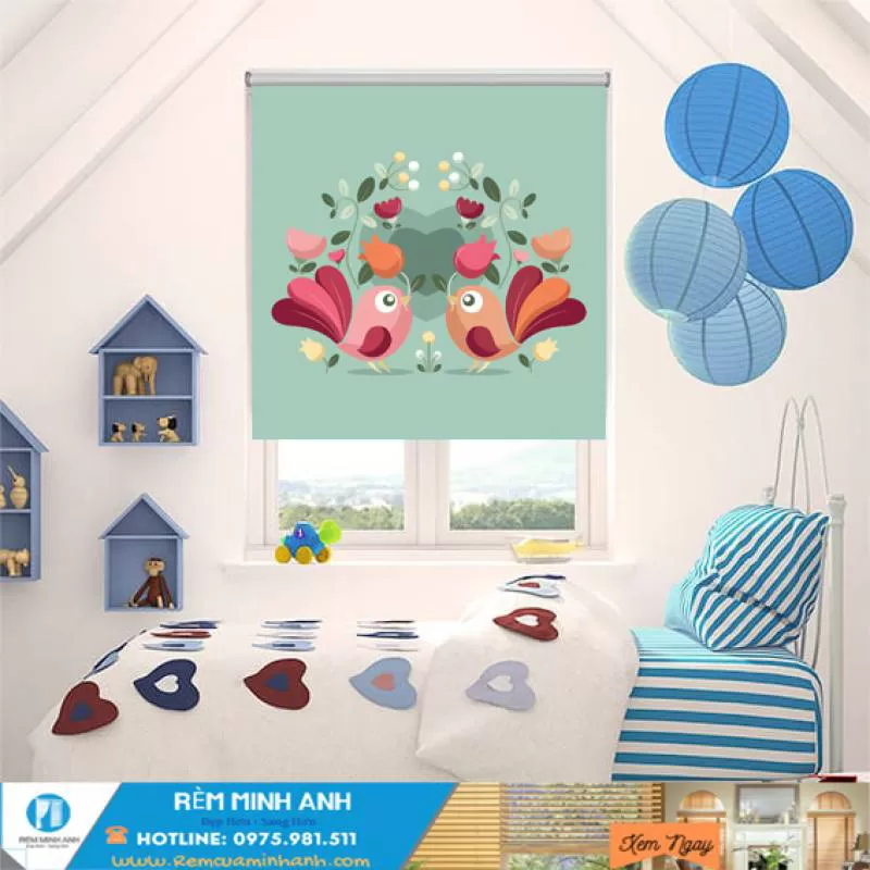 Rèm cuốn in tranh trẻ em vừa là rèm đồng thời nó lại có những họa tiết hoa văn ngộ nghĩnh rất thích hợp với trẻ như hình chim muôn hoa lá.