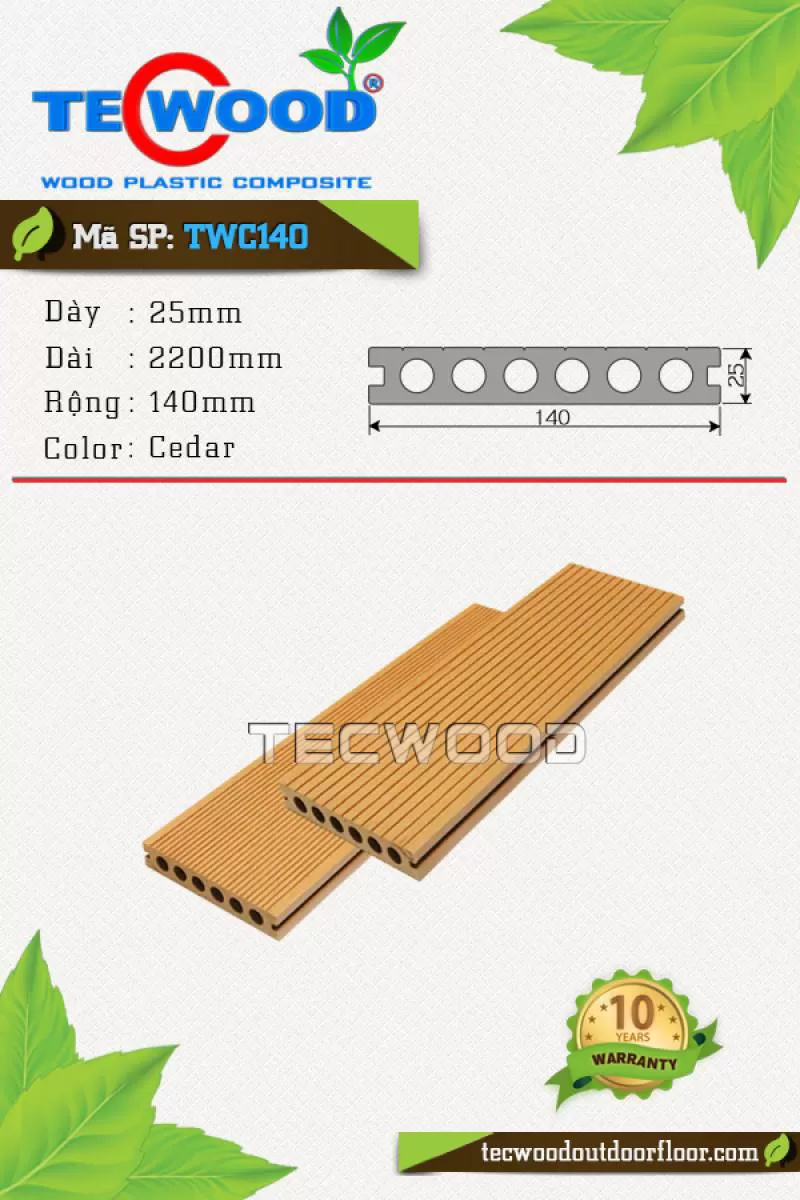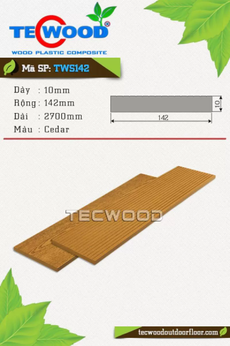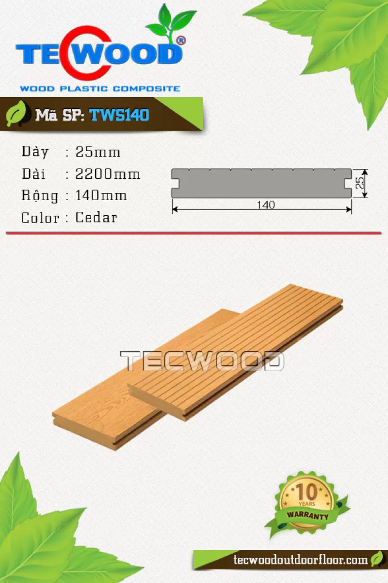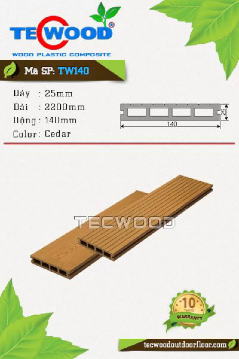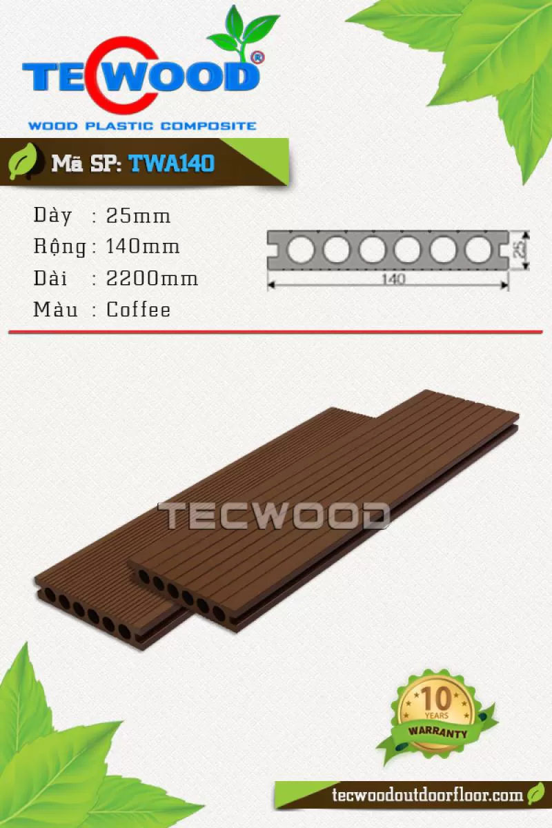 Sàn gỗ TWA140 là vật liệu gỗ nhựa TecWood với quy cách 25x140x2200mm chuyên dùng cho lót sàn ngoài trời với giá 1.350.000 vnđ/m2 chưa gồm phí thi côngShipping/Vận chuyển