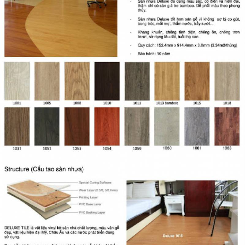 Sàn nhựa giả gỗ Deluxe mang đến cho bạn nhiều chọn lựa về quy cách, độ dày, lớp phủ...theo yêu cầu của Quý khách hàng.
