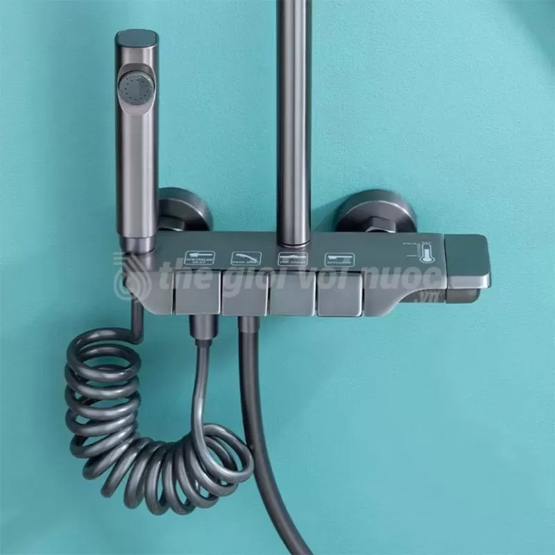 - Chất liệu: Đồng Thau/ABS/Lõi van gốm sứ- Màu sắc: ghi xám- Tính năng đặc biệt: nút bấm dạng bàn phím piano- Chức năng: Tắm toàn thân bát sen đỉnh, tay sen cầm tay 3 chế độ xả, vòi xả phụ, vòi xịt, chỉnh chế độ nước nóng lạnh theo yêu cầu.- Trọng lượng: 6,5kg