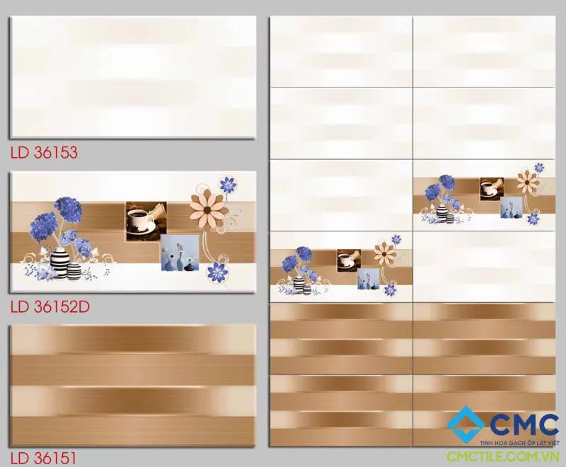 Bộ gạch ốp tường màu nâu đồng, trắng ánh kim và họa tiết xanh tím than LD 36151-52D-53