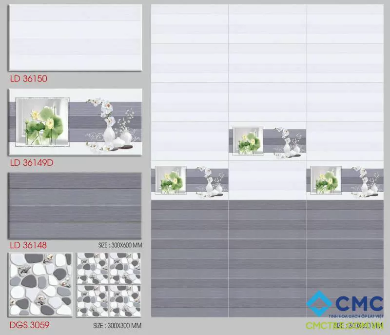 Bộ gạch ốp màu trắng, xám họa tiết hoa sen và hoa lan LD 36148-49-50
