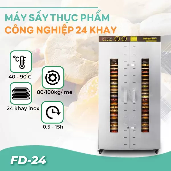 Máy sấy hoa quả công nghiệp 24 khay inox lớn, lên đến 100kg/ mẻ