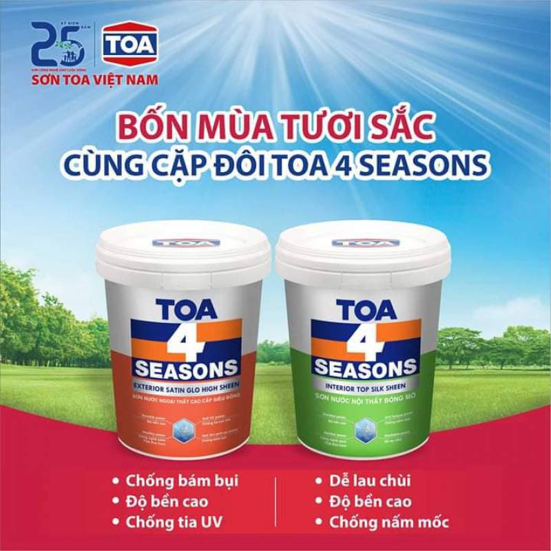 TOA 4 Seasons Exterior Satin Glo High Sheen thích hợp cho việc trang trí ngoại thất trên các bề mặt cũ và mới như bê tông, tường xi măng, gạch ngói, v.v…
