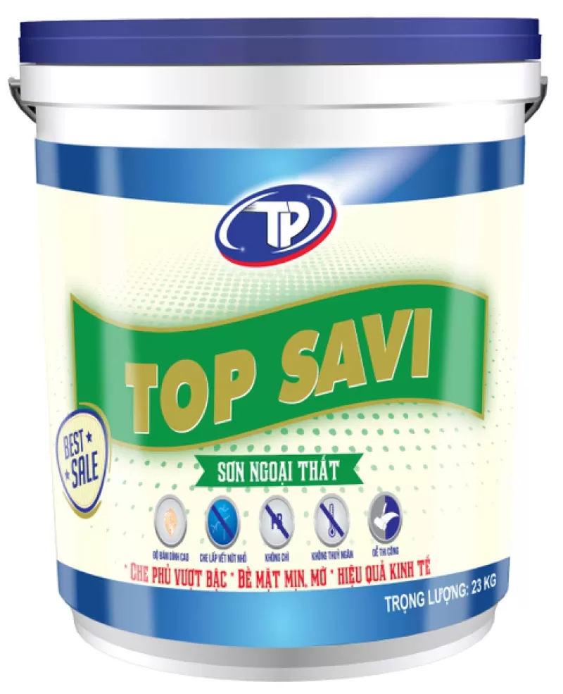 Sơn nước Top Savi ngoại thất của TOPPAINT là loại sơn thể nhũ được pha chế đặc biệt để sử dụng cho các công trình nhà ở và bảo vệ mặt tường khỏi các tác động của thời tiết. Bề mặt hoàn thiện Mịn mờ Đặc tính nổi bật • Đặc tính bám dính tốt • Đặc tính che phủ tốt • Màng sơn chống kiềm hóa tốt • Không chứa Formaldehyde •