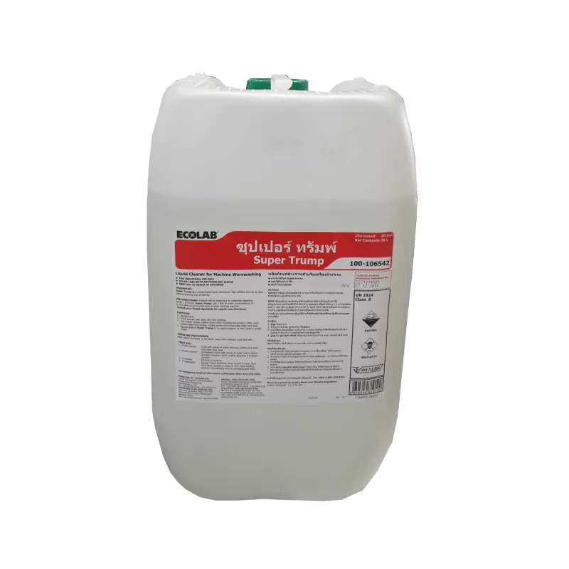 Super Trump là một hóa chất tẩy rửa dùng cho máy rửa chén đậm đặc dạng lỏng, với hoạt tính kiềm cao. Sản phẩm có thành phần làm mềm nước, đặc biệt thích hợp để hạn chế các đốm và các vệt nước sau khi rửa.Shipping/Vận chuyển