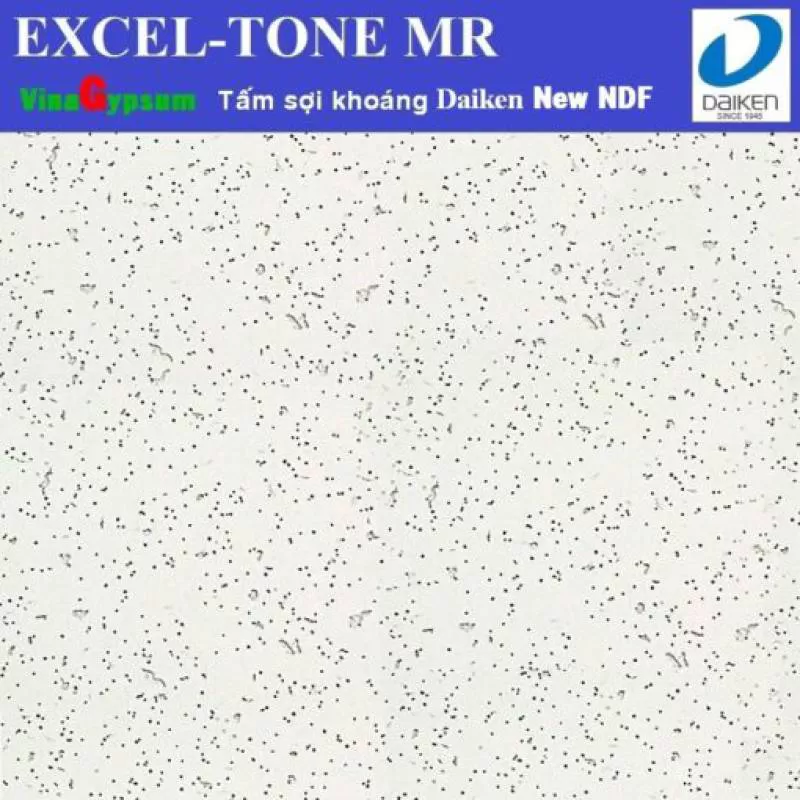 Excel – Tone MR ( New NDF ) là loại tấm tiêu âm, mỹ thuật, chống ẩm cao (RH 99%, t0 500C được lắp đặt với khung xương chữ T, chữ H hoặc thanh chữ Z (ở Việt Nam, lắp đặt với thanh chữ T được sử dụng rộng rãi). Excel- Tone MR có loại cạnh vuông phẳng, cạnh vát có gờ với các độ dày 1/2′( 12.7mm), 5/8″(15.8mm). Tuy nhiên, độ dày 5/8″(15.8mm) được khuyến khích sử dụng đồng bộ cùng khung xương Daiken có khả năng chống võng tuyệt hảo.