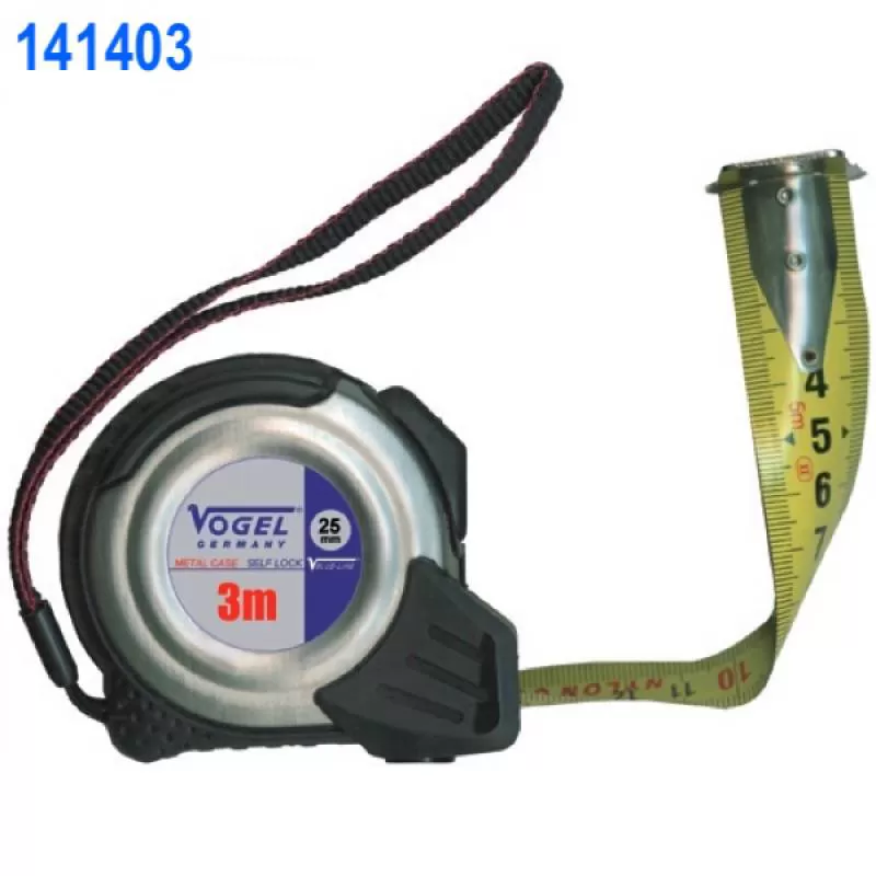 Thước cuộn 3m vỏ inox 141403 Vogel Germany. Vỏ bọc cao su chống sock. Đọc kết quả đo ở 2 mặt thước. Đầu lá thước có nam châm. Sản xuất tại Đức.