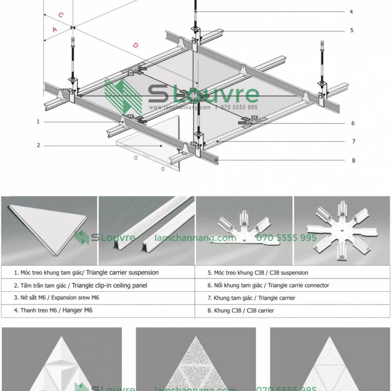 Trần nhôm tam giác là hệ trần treo không lộ khung xương mang hiệu ứng thẩm mỹ cao. Hệ trần nhôm sử dụng khung xương treo tam giác kẹp để giữ hai mép tấm trần vào thanh xương; giữ các tấm trần thẳng hàng và cân bằng. Vì vậy, trần tam giác có kết cấu thật vững chắc. Kết hợp đa dạng các hệ thống đèn chiếu sáng cho công trình đẹp bền vững.