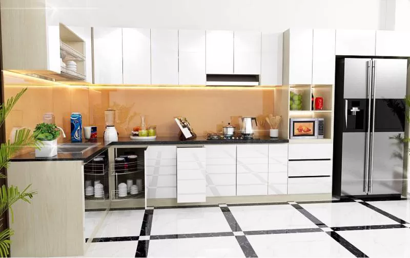 tủ bếp chữ l với kiểu dáng hiện đại kết hợp chất liệu acrylic bóng gương sẽ mang đến sự sang trọng và tiện nghi cho căn bếp của bạnShipping/Vận chuyển