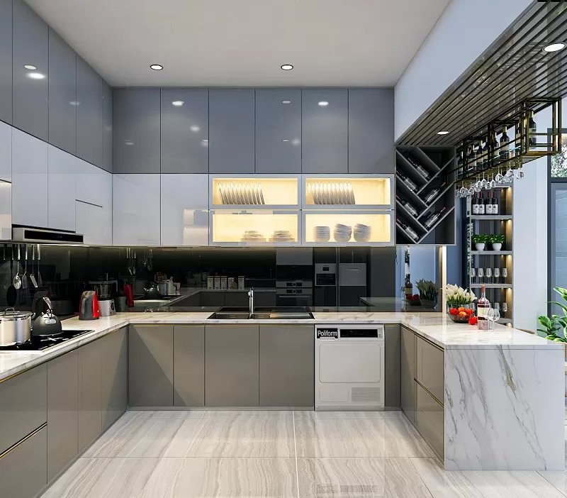 Tủ bếp chữ U đụng trần 150TP