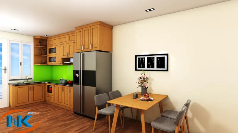 Tủ bếp chung cư thường thiết kế nhỏ nhắn, xinh xắn cho phù hợp không gian bếp. Với mẫu tủ bếp sồi nga chữ L thiết kế rất gọn gàng lại bắt mắt cho căn bếp hiện đại.