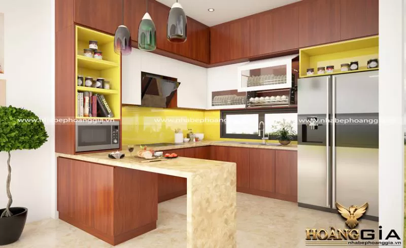 Mẫu thiết kế tủ bếp gỗ tự nhiên sơn PU 32 có kiểu dáng chữ U vô cùng phù hợp với căn bếp nhỏ. Bạn sẽ nhận thấy được sự sắp xếp đồ đạc của phòng bếp này được tiện lợi hơn, khoa học và đặc biệt rất thẩm mỹ
